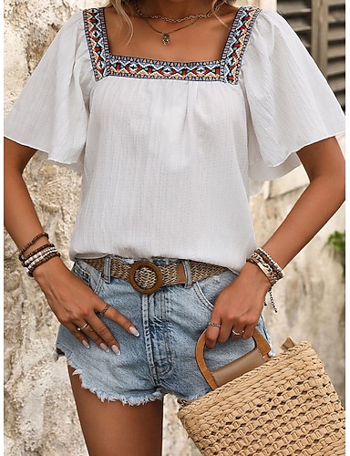 Per donna Camicia Boho Top estivi Blusa Top Eleganti Arricciato Volant Patchwork Semplice Elegante Vintage Signore Manica Corta Collo quadrato Top Regolari Quotidiano Lavoro Ferie Blu Nero Bianco Rosa