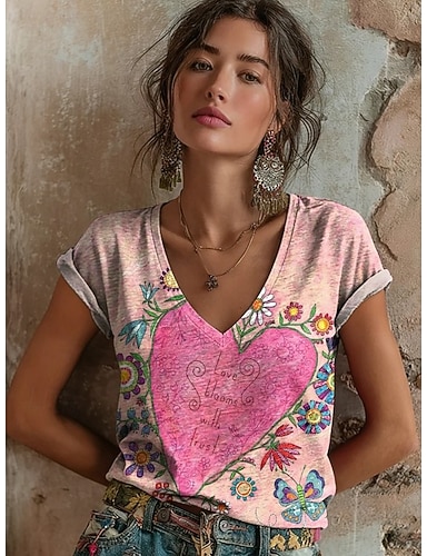 San Valentino Per donna Maglietta Stampato Cuore Floreale Grafico Vintage Elegante Classico Manica Corta Scollo a V Top Regolari Quotidiano Beige chiaro Giallo Rosa Estate Primavera