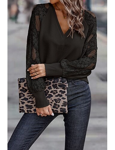 Per donna Top a maglia a coste Top con cuciture in pizzo Pizzo Ricamato Rete Elegante Casual Manica Lunga Scollo a V Top Regolari Quotidiano Uscire Marrone Scuro Nero Blu turchese Verde Primavera