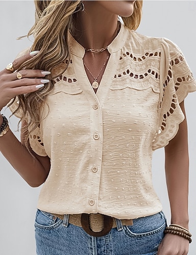 Per donna Camicia traforata Top traforato Bottoni Quotidiano Manica Corta Scollo a V Top Regolari Casuale Quotidiano Spiaggia Verde salvia Nero Bianco Rosa Azzurro cielo Estate