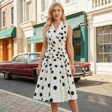 Elegante Anni 1950 Midi Vestito Maniche corte Tinta unica A Pois Linea ad A Scollo a V Costume Per donna Casuale Feste Abbigliamento Quotidiano Adulti Vestito Primavera & Estate
