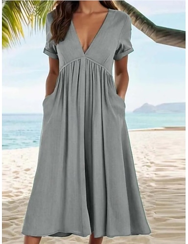 Per donna Abito Midi Finto cotone e lino Vestito Casual Elegante Moda Moderno All'aperto Vacanza Uscire Vestibilità comoda Semplice Manica Corta Scollo a V Blu Bianco Verde Grigio Estate Primavera