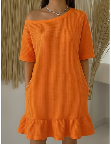 Per donna Abito al ginocchio Vestito Casual Vintage Moda Quotidiano All'aperto Vestibilità comoda Colore Puro Manica Corta Monospalla Arancione Estate Primavera
