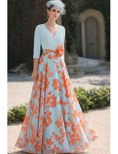 Linea ad A Abito Lunghezza al pavimento Abito da invitata a nozze Abito da cerimonia per signora Manica 3/4 Scollo a V Elegante Vintage Semplice Formale Chiffon con Stampa floreale Arricciato