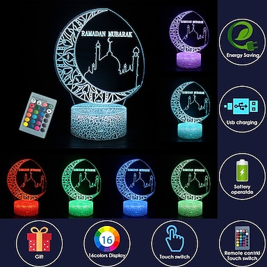ramadan 3d luna luci notturne decorazione mubarak islam chiesa 16 cambiamento di colore telecomando luce notturna decorazione atmosfera musulmana lampada per camera da letto soggiorno eid al-fitr luce