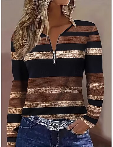 Per donna Maglietta Cerniera Stampato Ombre Grafico Sfumatura Elegante Vintage Classico Manica Lunga Girocollo Collo a V Top Regolari Quotidiano Weekend Marrone chiaro Primavera Autunno Inverno