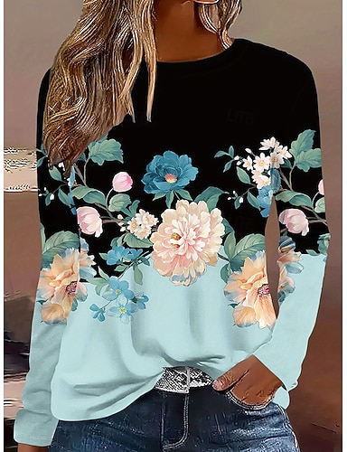 Per donna Maglietta Stampato Floreale Grafico Piante Vintage Elegante Classico Manica Lunga Girocollo Top Regolari Quotidiano Azzurro Primavera Autunno Inverno