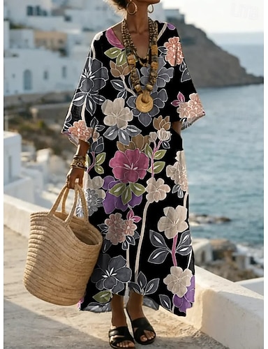 Per donna Abito maxi Abito a Tubino Vacanza Casual Boho All'aperto Spiaggia Uscire Vestibilità comoda Floreale Grafico Manica Lunga Scollo a V Grigio verde Nero Marrone chiaro Estate Primavera