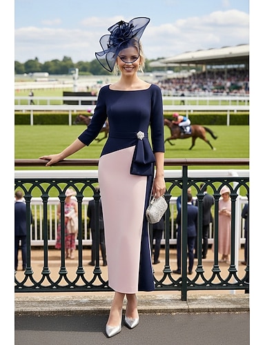 Tubino Colonna Lunghezza alla caviglia Abito da Cocktail Abito da invitata a nozze Abito Derby Abito da cerimonia per signora Manica 3/4 Scollo Tondo Elegante Formale Raso Elasticizzato Crepe