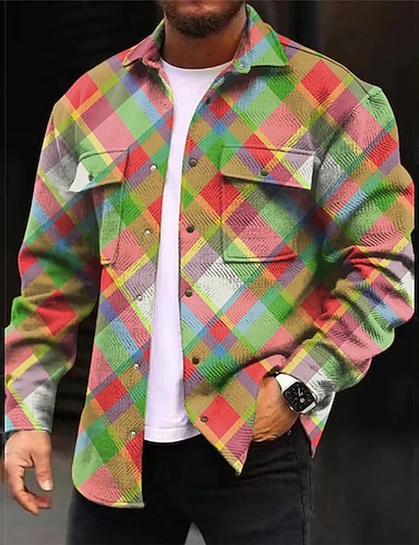 Per uomo A quadri Geometrica Rampa gradiente Camicia Giacca da camicia Sovracamicia Manica lunga Informale Esterno Strada Casual / quotidiano Autunno inverno Collo ripiegabile Bottoni Tasche Stampa