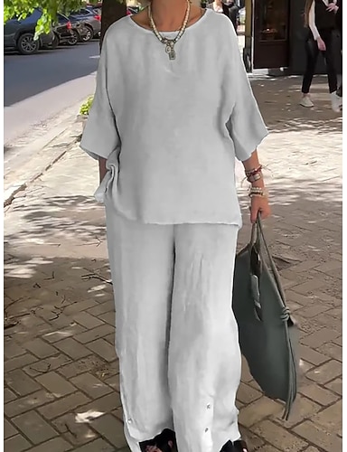 Per donna Set di Pantaloni Finto cotone e lino Manica 3/4 Girocollo Semplice Patchwork Vacanza Moda Streetwear Casuale Quotidiano All'aperto Nero Bianco Giallo Estate Vestibilità comoda
