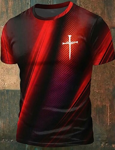 T-shirt da uomo moderna con stampa grafica a gradiente rosso e nero, girocollo, maniche corte, con croce, ideale come regalo per lui, abbigliamento firmato.