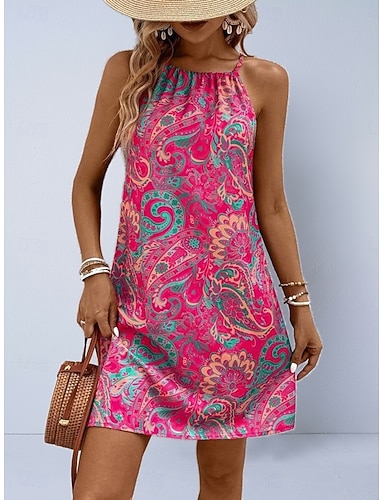 Per donna Mini Abito Abito in Raso Vestito da Festa Abito con Collo Allacciato Moda Moderno All'aperto Spiaggia Vacanza Vestibilità regolare Paisley Senza Maniche Spalline All'americana Rosso Estate