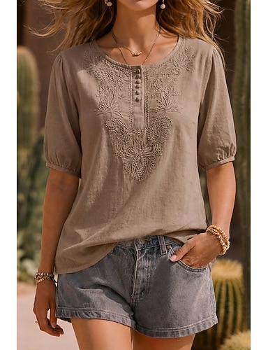 Per donna Camicie di cotone e lino Blusa Finto cotone e lino Bottoni Tinta unica Quotidiano Elegante Essenziale Manica 3/4 Scollo a V Top Regolari Quotidiano Nero Bianco Arancione Estate Primavera