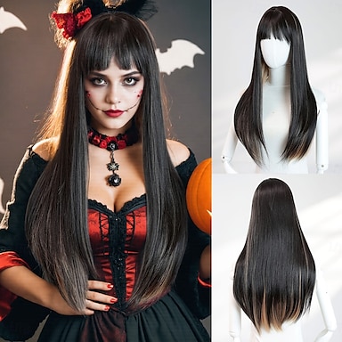 parrucca nera liscia da 24 pollici per donna – capelli lunghi con frangia piena, ideale per Halloween, costumi e look alla moda eleganti