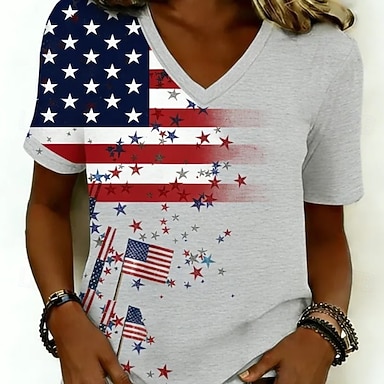 Giorno dell'Indipendenza Americana Per donna Maglietta Stampato Grafico Bandiera Americana Vintage Elegante Classico Manica Corta Scollo a V Top Regolari Quotidiano Blu Bianco Grigio carbone Rosso e