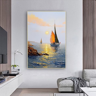dipinto a olio fatto a mano su tela, decorazione da parete, decorazione originale per la casa con barca a vela, con cornice allungata, senza cornice interna