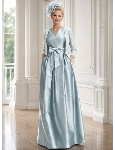 Due Pezzi Linea ad A Lunghezza al pavimento Abito da invitata a nozze Abito da cerimonia per signora Manica 3/4 Scollo a V Elegante Brillare & Splendere Formale Ricevimento di matrimonio Raso Con