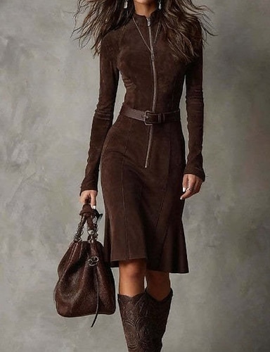 Per donna Mini Abito Abito occidentale Abito in finta pelle scamosciata Elegante Moda Moderno All'aperto Vacanza Feste Vestibilità regolare Semplice Manica Lunga Scollo a V Marrone Primavera Autunno