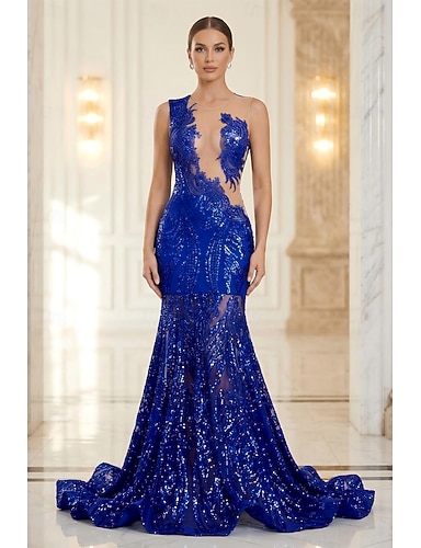 Sirena Tromba Strascico da Corte Abiti da Ballo Abito da Sera Da principessa Abito formale Elegante Festa Senza Maniche Collo gioiello Balli di fine anno Fidanzamento Afroamericano Con Paillettes con