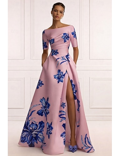 Linea ad A Lunghezza al pavimento Abito da Sera Da principessa Elegante Vintage Floreale Mezza Manica Scollo a Barca Festa in giardino Matrimonio Tasca Raso con Stampa floreale Pieghe Tasca