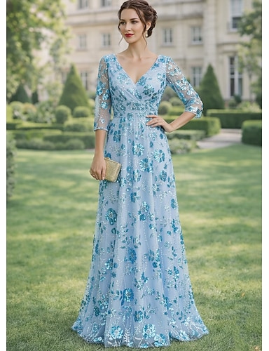 Linea ad A Lunghezza alla caviglia Lunghezza Tè Abito Formale Abito da cerimonia per signora Manica 3/4 Scollo a V Elegante Vintage Abbellito Formale Chiffon Pizzo con Paillettes Ricamo