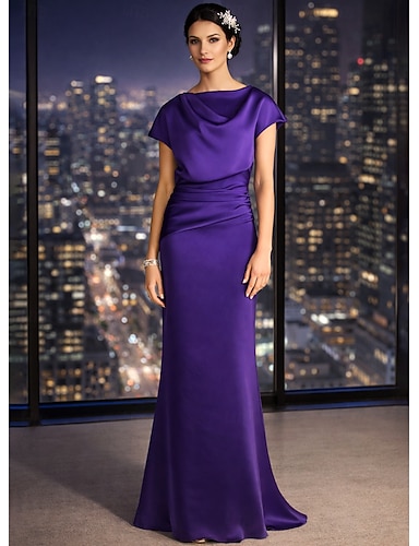 Tubino Colonna Abito Lunghezza al pavimento Abito da invitata a nozze Abito Formale Abito da sera Abito da cerimonia per signora Manica Corta Senza Spalle Elegante Formale Raso con Arricciato Tinta