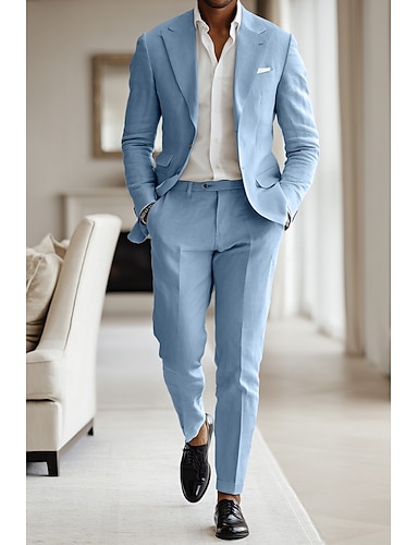 Uomo Completi in Lino Casuale Matrimonio Rosa Azzurro cielo Primavera & Estate Tuta Bavero classico Moda Casual Tinta unita Vestibilità su misura 2 pezzi Monopetto Due Bottoni