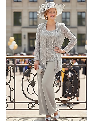 Completo pantaloni Abito per la madre della sposa di lunghezza fino al pavimento a maniche lunghe scollatura quadrata elegante invitata al matrimonio in pizzo con tinta unita