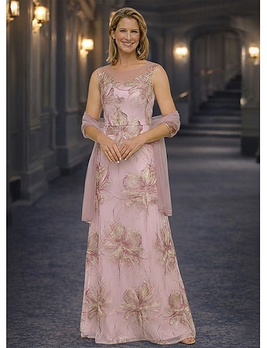 Linea ad A Lunghezza al pavimento Abito da cerimonia per signora Mezza Manica Scollo Illusione Scollo Tondo Elegante Vintage Formale Ospite di nozze Serata Formale Chiffon Organza Jacquard con Fiore