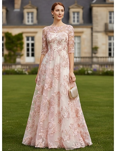 Linea ad A Lunghezza al pavimento Abito da cerimonia per signora Mezza Manica Scollo Illusione Scollo Tondo Elegante Vintage Formale Ospite di nozze Serata Formale Chiffon Organza Jacquard con Fiore