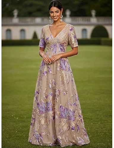 Linea ad A Lunghezza al pavimento Abito da cerimonia per signora Manica Corta Scollo a V Elegante Vintage Lussuoso Formale Ospite di nozze Ricevimento di matrimonio Chiffon Pizzo con Stampa floreale