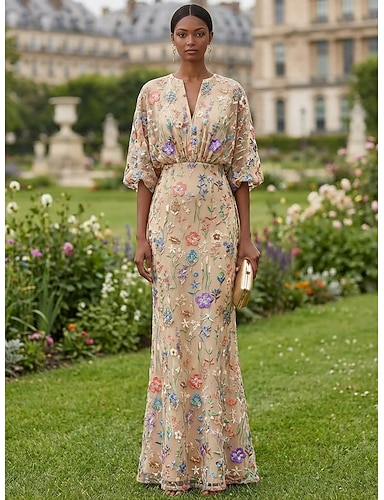 Linea ad A Abito Lunghezza al pavimento Vestito maxi Vestito da Festa Abito da Cocktail Abito da cerimonia per signora Mezza Manica Scollo a V Elegante Vintage Lussuoso Formale Ospite di nozze