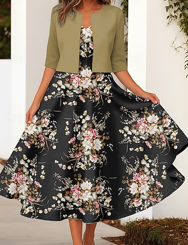 Due Pezzi Linea ad A Lunghezza Tè Abito da invitata a nozze Abito da cerimonia per signora Senza Maniche Manica 3/4 Girocollo Elegante Semplice Minimalista Formale Semi-Formale Chiffon Jacquard con