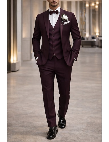 Uomo Smoking Completi Matrimonio in Spiaggia Matrimonio primaverile Borgogna Uva Primavera & Estate Tuta Bavero classico Moda Formale Tinta unita Vestibilità standard 3 pezzi Monopetto a un bottone