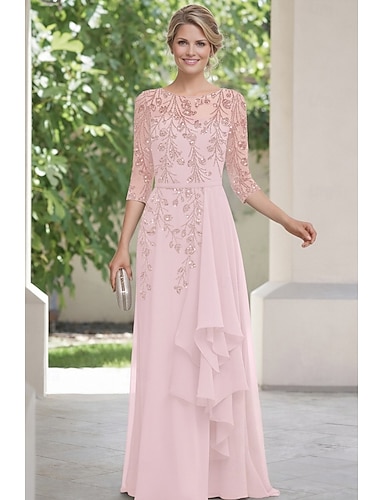 Linea ad A Abito Lunghezza al pavimento Abito da invitata a nozze Abito Formale Abito da sera Abito da cerimonia per signora Mezza Manica Scollo a Barca Elegante Semplice Abbellito Formale Chiffon
