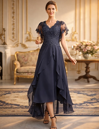 Linea ad A Lunghezza Tè Vestito da Festa Abito da Cocktail Abito da invitata a nozze Abito da cerimonia per signora Manica Corta Scollo a V Elegante Formale Ospite di nozze Serata Formale Chiffon con