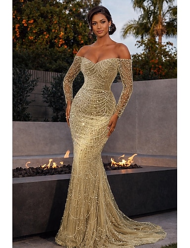 Sirena Tromba Lunghezza al pavimento Perline ricamate Abito Formale Abito da madre della sposa Abiti da Ballo Abito da Sera Abito formale Elegante Scintillante Stile Celebrità Manica Lunga Monospalla