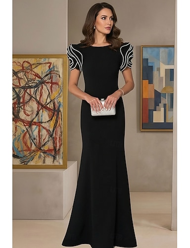 Abito a-line lungo fino al pavimento abito formale abito da sera abito da sera elegante vintage abito nero maniche corte scollo tondo matrimonio San Valentino senza schiena con rouches