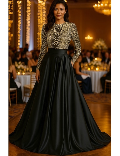 Linea ad A Lunghezza al pavimento Abito da Sera Da principessa Abito formale Elegante Scintillante Setoso Manica Lunga Girocollo Matrimonio Formale Tasca Con Paillettes con Glitter
