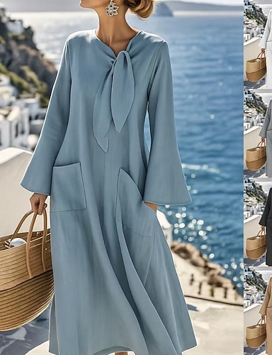 Per donna Abito Midi Finto cotone e lino Abito a trapezio Casual Quotidiano Vestibilità comoda Semplice Manica Lunga Scollo a V Blu blu navy Nero Bianco Estate Primavera Autunno