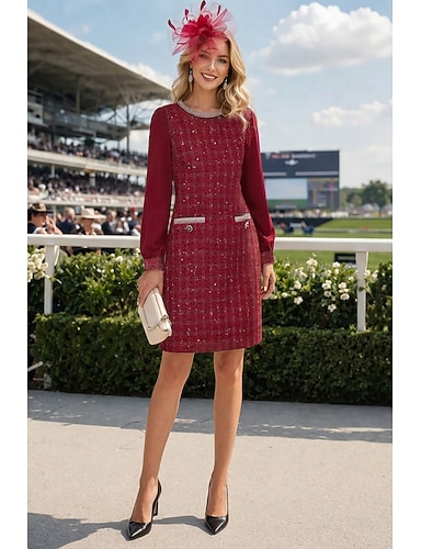 Abito a tubino a lunghezza ginocchio Abito da festa Abito da cocktail Abito per matrimonio Abito per madre della sposa Maniche lunghe Girocollo Elegante Vintage Festa in cotone misto con blocchi di