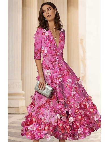 Linea ad A Lunghezza alla caviglia Abiti da Cocktail Abiti da festa Elegante Vintage Floreale Mezza Manica Scollo a V Matrimonio Formale Vestito Rosa Raso con Ricamo Tasca