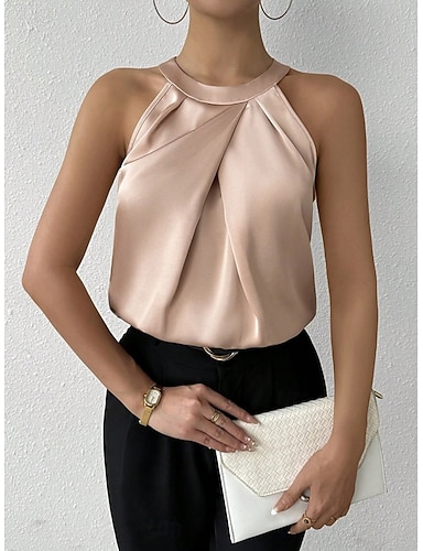 Per donna Elegant Top in raso Camicia in raso Camicia con collo camp Arricciato Tinta unica Elegante Essenziale Casual Senza Maniche All'americana Top Regolari Quotidiano Ferie Uscire Nero Bianco