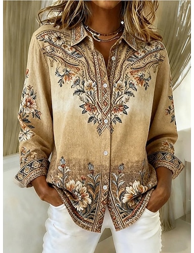 Per donna Camicia Blusa Patchwork Bottoni Stampato Floreale Grafico Geometrico Bohemien Vintage Casual Manica Lunga Colletto a Camicia Top Regolari Quotidiano Arancione Marrone Verde Primavera
