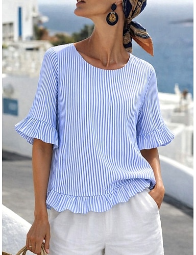 Per donna Blusa Volant Stampato A righe Elegante Casual Manica 3/4 Girocollo Top Regolari Quotidiano Blu Estate Primavera Autunno
