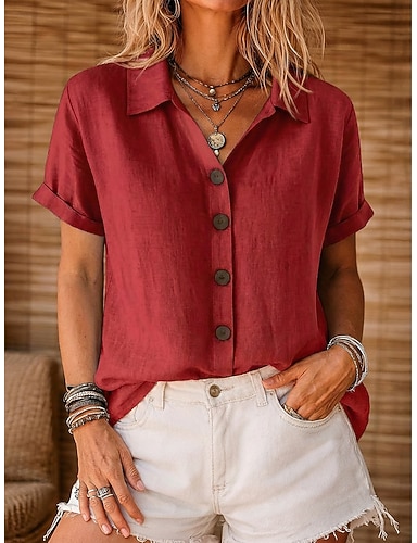 Per donna Camicia Camicie di cotone e lino Blusa Tinta unica Essenziale Casual Manica Corta Bavero Top Regolari Casuale Quotidiano Blu Bianco Rosa Rosso Verde Estate Primavera
