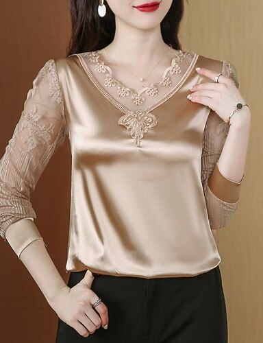 Per donna Camicia Elegant Top in raso Blusa Patchwork Rete Semplice Elegante Manica Lunga Scollo a V Top Regolari Quotidiano Ferie Uscire Nero Estate Primavera