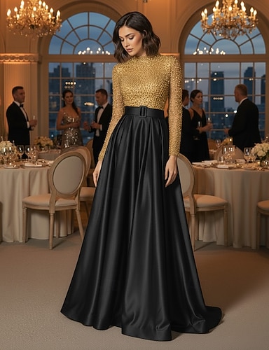 Linea ad A Tubino Colonna Lunghezza al pavimento Abiti da Ballo Abito da Sera Da principessa Abito formale Elegante Scintillante Stile Celebrità Manica Lunga Collo Alto Festa in giardino Matrimonio