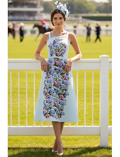 Linea ad A Lunghezza Tè Abito da Cocktail Abito Derby Abiti da Cocktail Abiti da festa Elegante Quotidiano Senza Maniche Spalline sottili Matrimonio Derby del Kentucky Raso con Stampa floreale